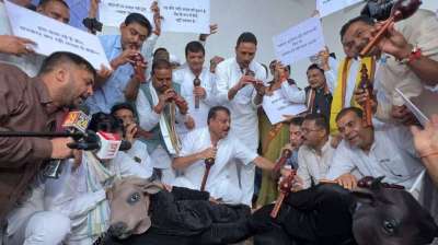 कांग्रेस ने विधानसभा में भैंस के सामने बीन बजाकर किया प्रदर्शन