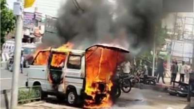 टक्कर में गई दो जिंदगियां, उग्र भीड़ ने जलाई वैन, इलाके में तनाव