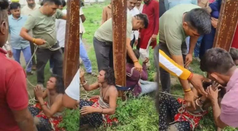 बच्चा चोरी के संदेह में भीड़ ने दो संदिग्ध व्यक्तियों को खंभे बंधकर पीटा