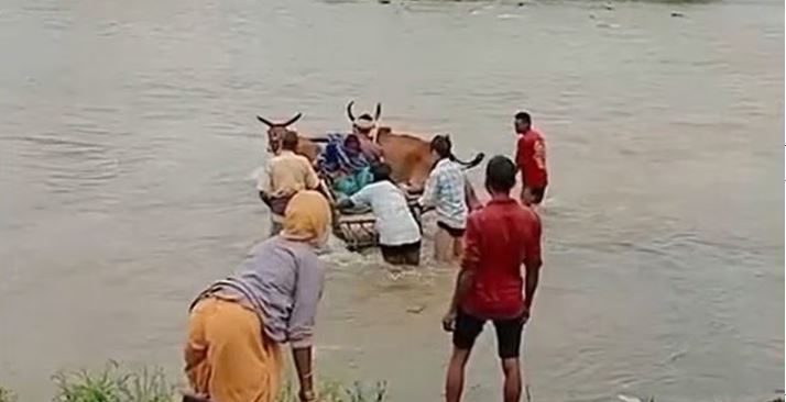 बैलगाड़ी से नदी पार कराई