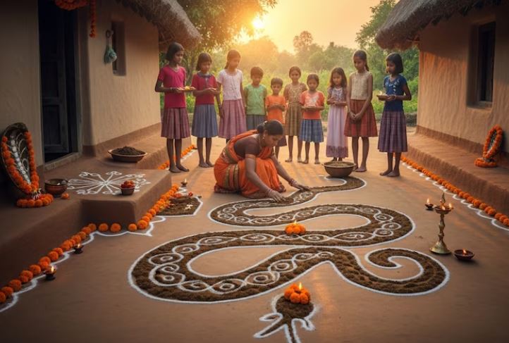 नाग पंचमी के दिन सुबह-सुबह लोग घरों के दरवाजे के दोनों ओर गाय के गोबर से नाग की आकृति बनाते हैं. यह परंपरा बहुत पुरानी है और इसे आज भी ग्रामीण इलाकों में खास तौर पर निभाया जाता है. इसके पीछे कुछ मान्यताएं हैं: