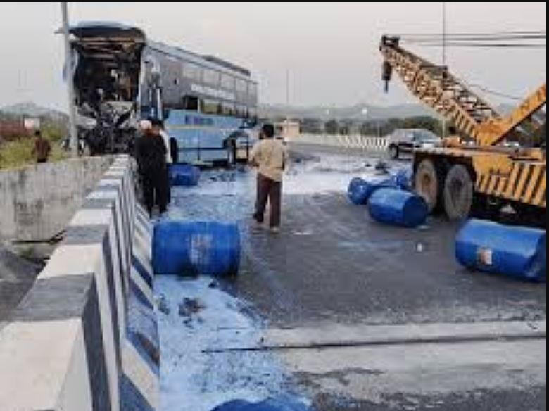 अलवर। दिल्ली-मुंबई एक्सप्रेसवे के चैनल नंबर 100 इंटरचेंज पुलिया पर मंगलवार को एक भीषण सड़क हादसा हो गया। पिनान गांव के पास चेनल नम्बर 110 की पुलिया के निकट हुए इस हादसे में एक ट्रैवल बस और केमिकल से भरे ट्रक की जोरदार टक्कर हो गई। यह घटना अलवर के राजगढ़ थाना क्षेत्र में हुई, जिससे इलाके में अफरातफरी मच गई।